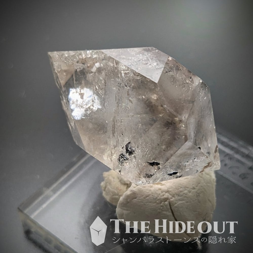 この産地では圧倒的多数がDT形状であり、稀に「ダイヤモンドクォーツ」と呼ばれるほどに照り・艶・反射が強いものが産出します。誰が呼んだか本場「ハーキマー」ダイヤモンドならぬ「パーキマー」 これらの水晶の中には黒いカーボンが内包されているものが多くありますが、同時に液体もインクルしているために、黒いカーボンがボコッと大きく動くことがあります。当然、液体バブルが動くものもあります。