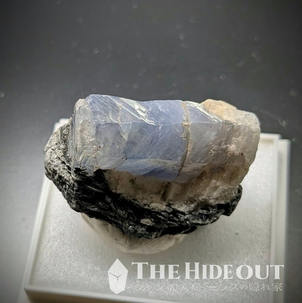 こういう景観を見ると「母岩付きが正義だなぁ」と思いますよね。石を蒐集しているぞ、という気分になりませんか。美しいパステルブルーのサファイアが横たわり、白い長石と黒メタリックの雲母がそれを支えます。透け感も素晴らしく、光を透かすと内部の色の濃淡もよくわかります。