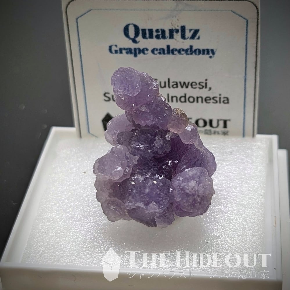 「グレープクォーツ」「グレープカルセドニー」「グレープアゲート」という通称がありますが、最も表現として相応しいのはカルセドニーですかね(結晶形が明瞭に見えるものがあるという事で「クォーツ」として分類するケースも多いようです)