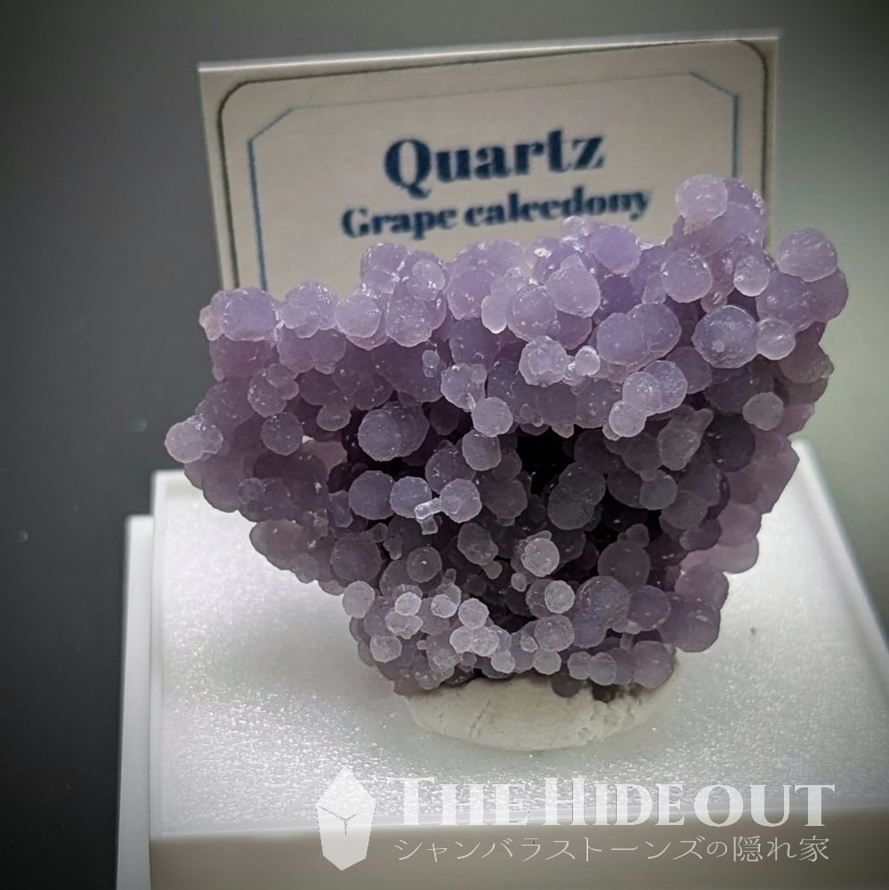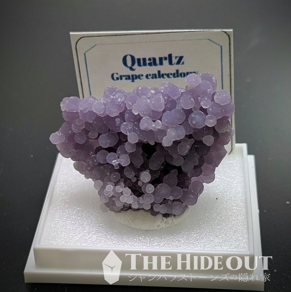 「グレープクォーツ」「グレープカルセドニー」「グレープアゲート」という通称がありますが、最も表現として相応しいのはカルセドニーですかね(結晶形が明瞭に見えるものがあるという事で「クォーツ」として分類するケースも多いようです)