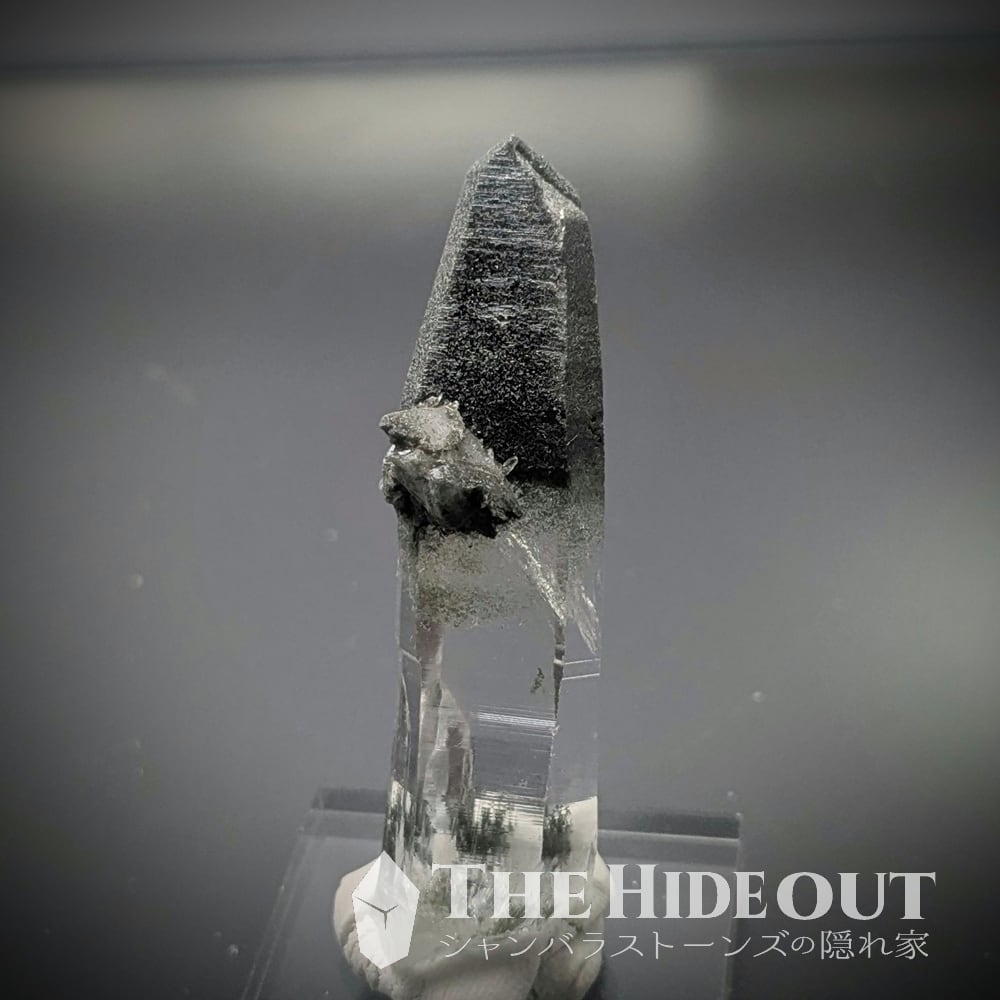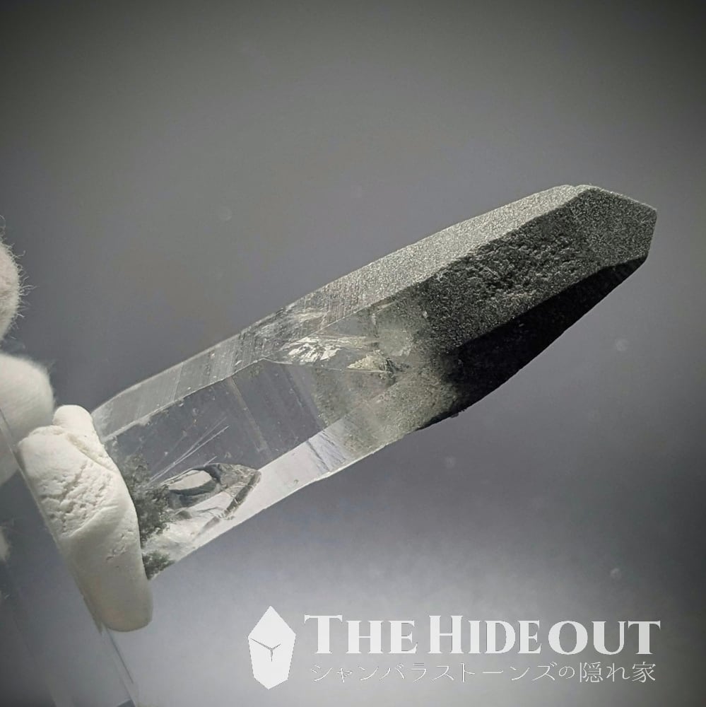 このように錐面側に見緑泥石が「溜まる」ものは長靴下を履いているように見えるので長靴下タイプと呼んでいました。降り注ぎにより上部に緑泥石が集中するのか?とも思いますが、単純に反対を向いて成長した(歯でいうところの上の歯のような状態)という可能性もありますね。 実際のところはわかりません。で、この長靴下タイプは概して透明部分の透明が強く硬質です。凛と冷たい透明です。スパイキーパサル終了の頃から随分ストックを放出してきましたが「長靴下」タイプはこれがラストワンです。※006番も同タイプですがすでにsoldoutです。希少性・面白さにしては安く設定したつもりです。