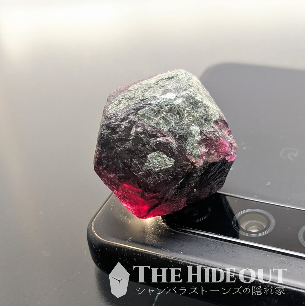 でかい。ずっしりと重いです。少なくとも私がみたスワチィ鉱山のアルマンディンの中でも最重量級です。表面は若干のガビガビ感がありますが、ガーネットらしい菱形12面体が楽しめます。少し残った雲母もワイルド。写真ではわかりにくいのですが「銀ピカ」ならぬ「緑ピカ」で手にしたときは想像しているよりも格好良いことに気が付くでしょう。