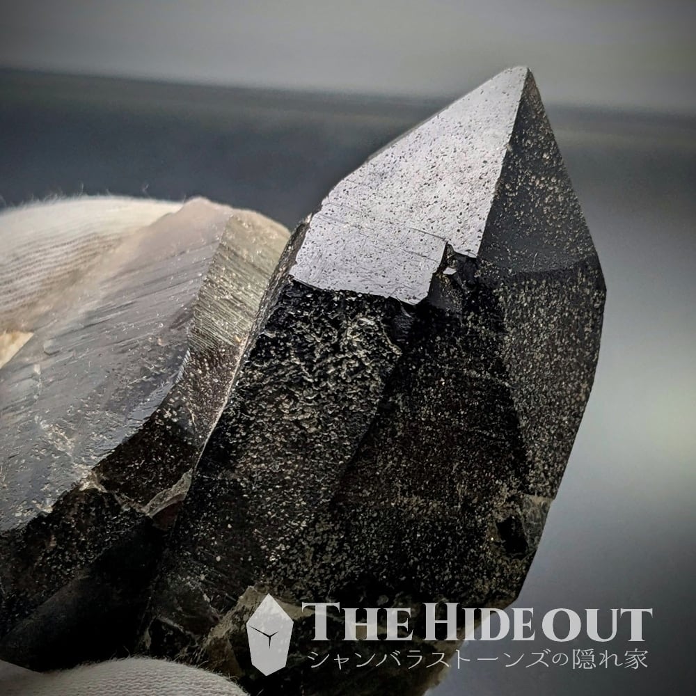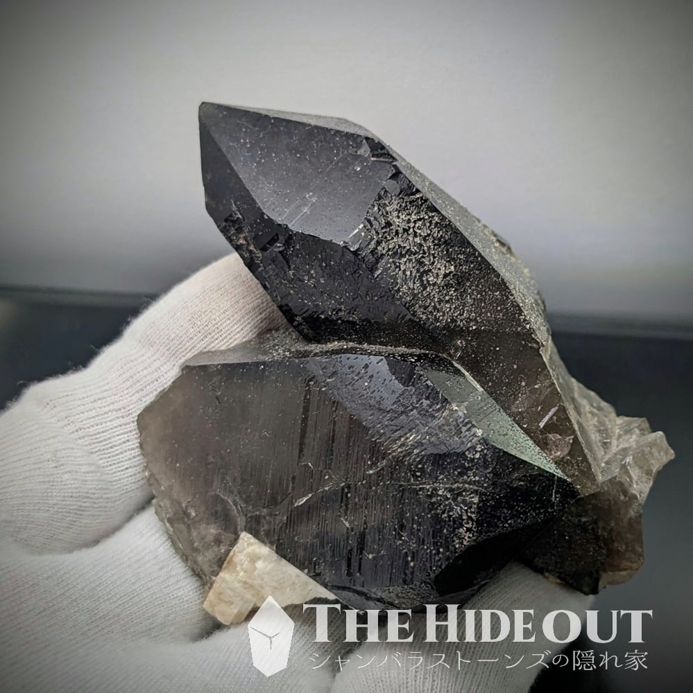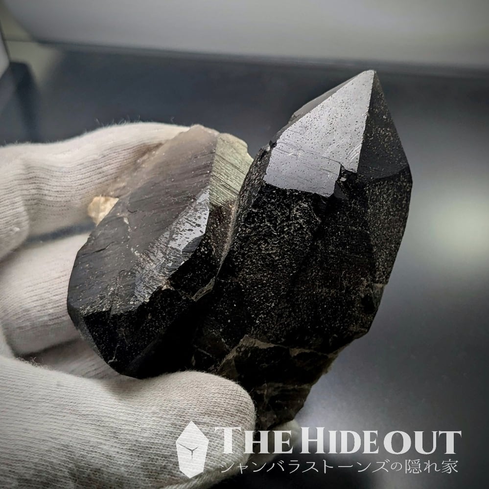 ひとつだけ蛭川産のオールドストックをお裾分けしてもらったのです。ですので泣いても笑ってもこれ一つしかありません。今後再び入手できるかと問われましても自信はない。この一発に賭けて下さい。折り重なるようなツインの形状も良く、お互い色も濃く照りも良く条線も強いです。先端までしゅっとダメージも無く完璧な結晶と言えるでしょう。田原はモリオンも出ますが、こちらは強い光に透かすと透けます。透けなければ…モリオンなのですがね。一般的な「スモーキークォーツ」よりは濃度が高いのでダークスモーキーってことで。かつては栄華を誇った産地も気が付けば夢の跡になるものです。ここで確保しておかないと、次いつ中津川の良品に出会えるかわかりませんよ。