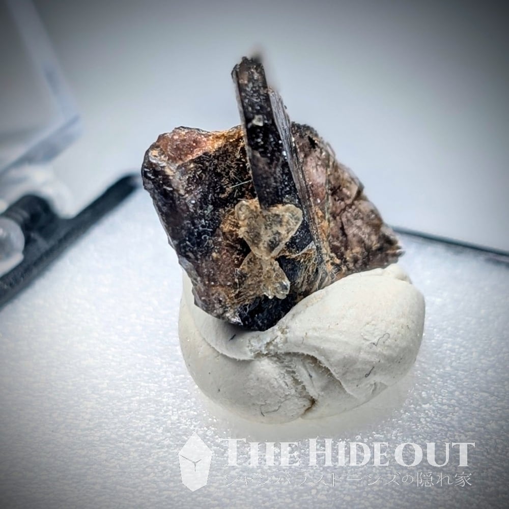 ひゃー、珍品です。面白い。双晶わかりますか?写真に捉えることができましたが、アキシナイトの側面にハート形の日本式双晶。かなり小さいですが、一度気が付くと肉眼でもわかります。ルーペで拡大するとますますキュンとします。2枚のハートが向かい合っているのですが、その佇まいだけで唯一無二。これだから堪らんな、鉱物は。もちろんアキシナイト自体もかなり良いです。見ての通り、ワインレッドのようなパープルのようなグレーのようなウイスキーのような…光源によって色が変わる多色性はお見事。そもそもこのくらい質の良い斧石は少ないです。