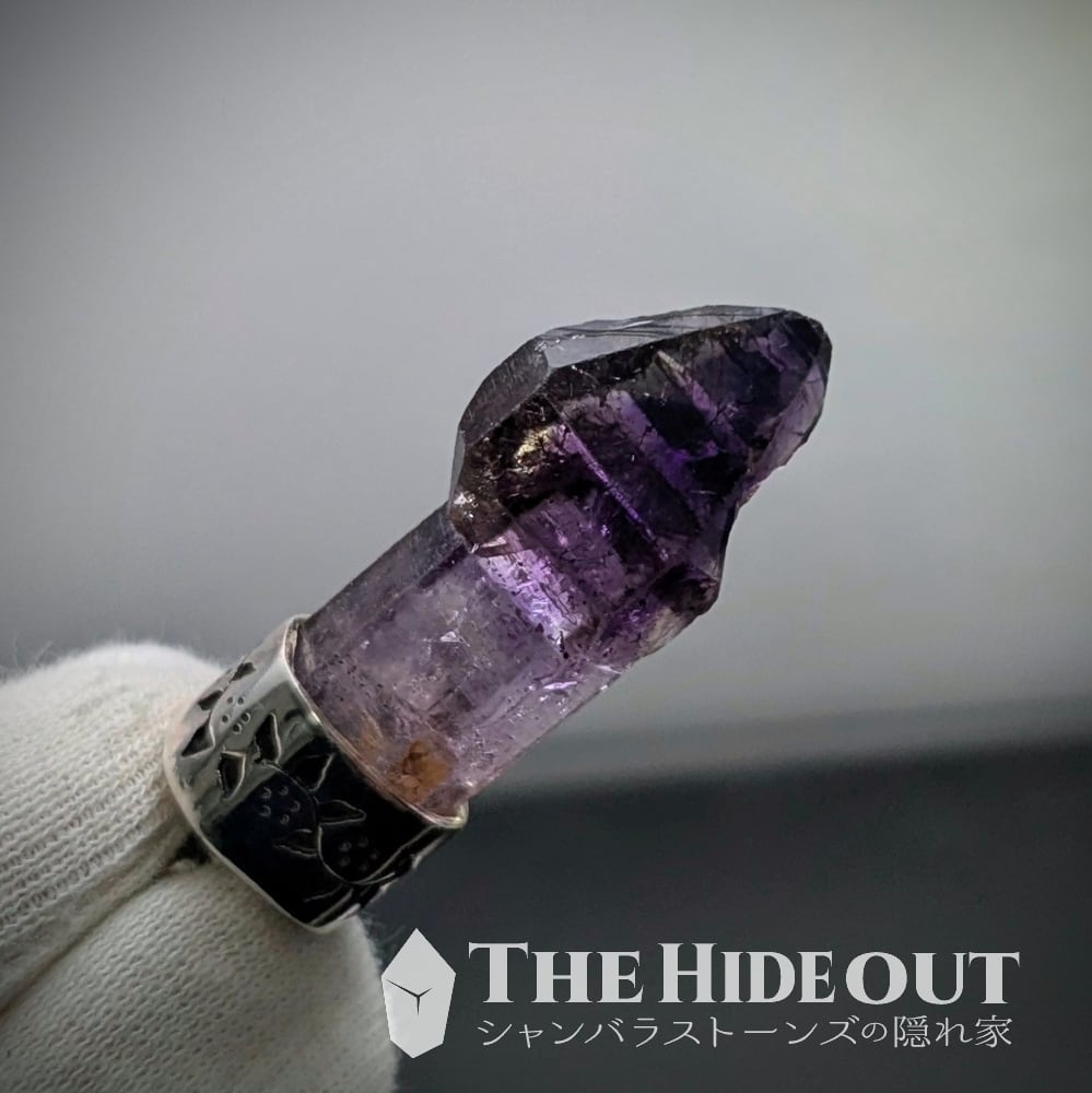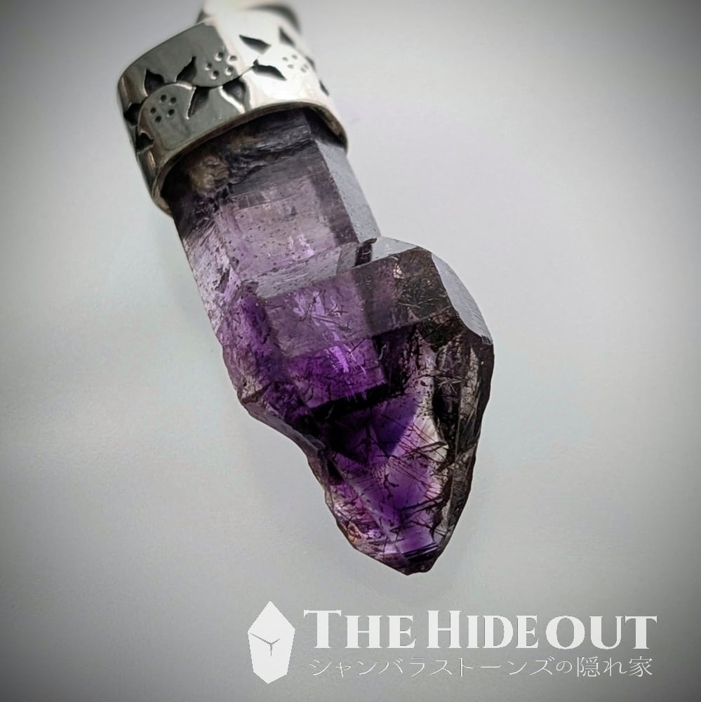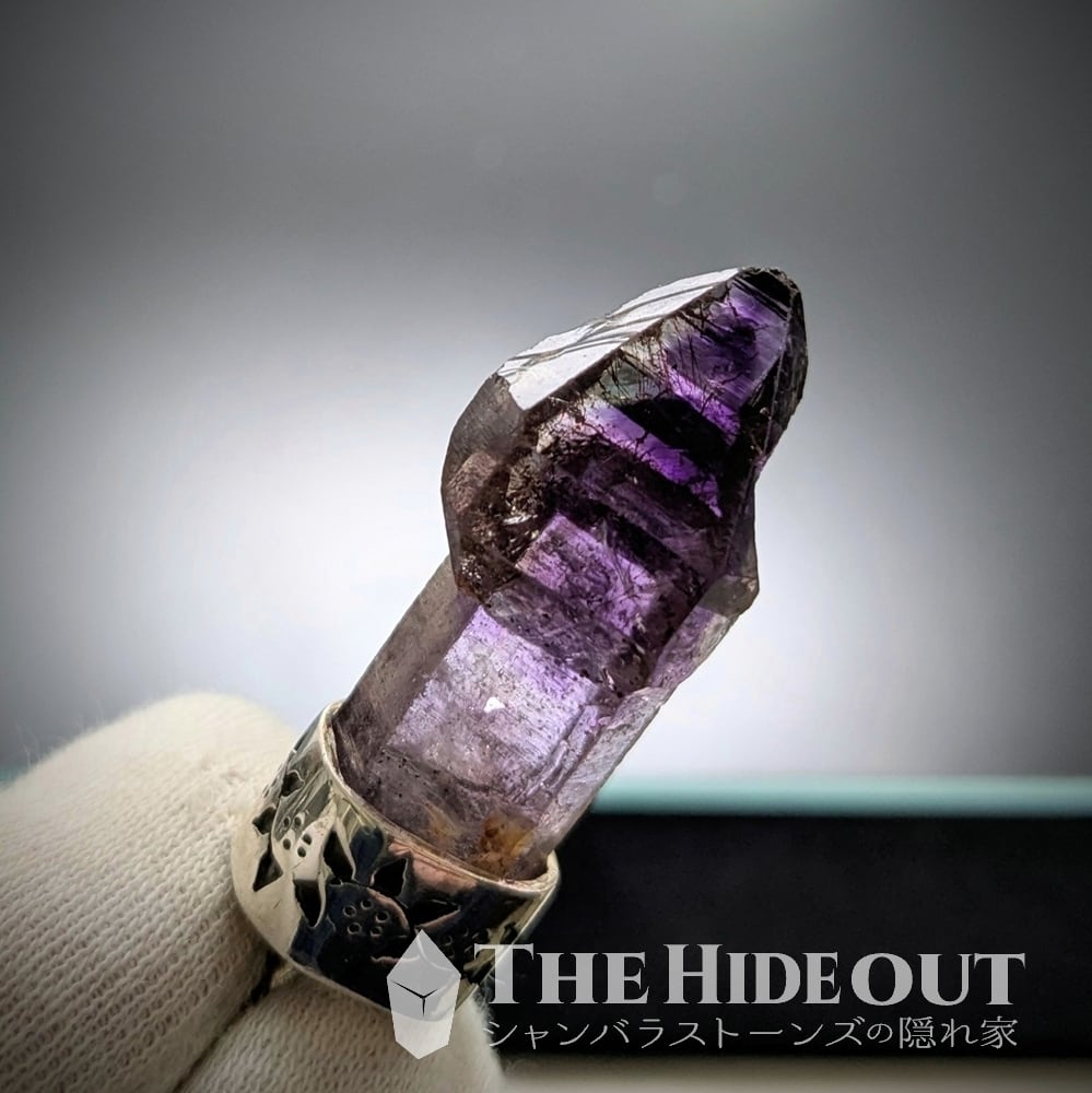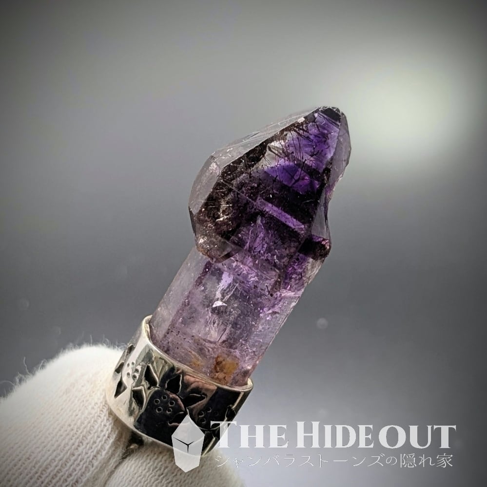 ジンバブエ産のアメスモは表面が曇っているものや汚れがこびりついているものが多く、研磨やバフ掛けなしで綺麗なものが決して多くありません(だからこそ市場でも未研磨原石標本はちゃんと高いです)こちらは未研磨・未バフ掛けです。それでこの輝きと照り艶ですからね。発達したセプターキャップも非常に美しく、ダメージも無し。色濃いアメジストのゾーニング(ファントムになっています)もとても良いですし、スモーキーの差し色も効いています。オマケにゲーサイトのボウフラたちも泳いでいます。根本の水晶に掛けて色が薄くグラデーションアウトしていくのも良いですね。凛と輝くシルバーと細やかな蔦の装飾もよく似合っています。最&高。