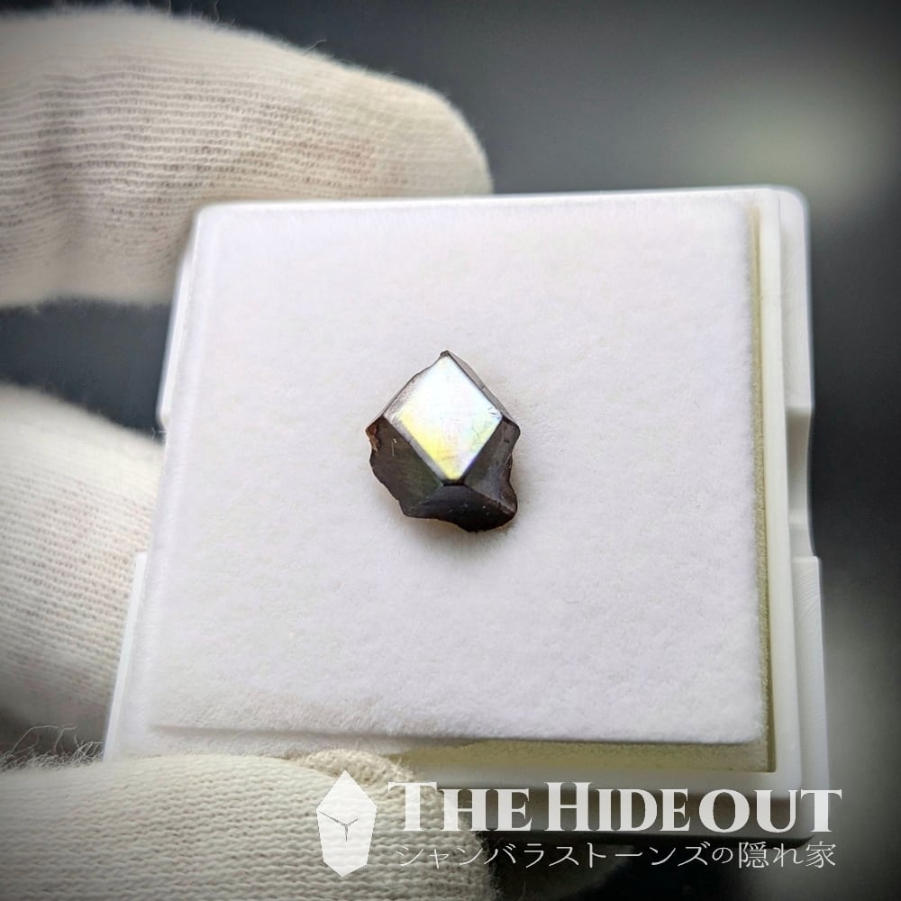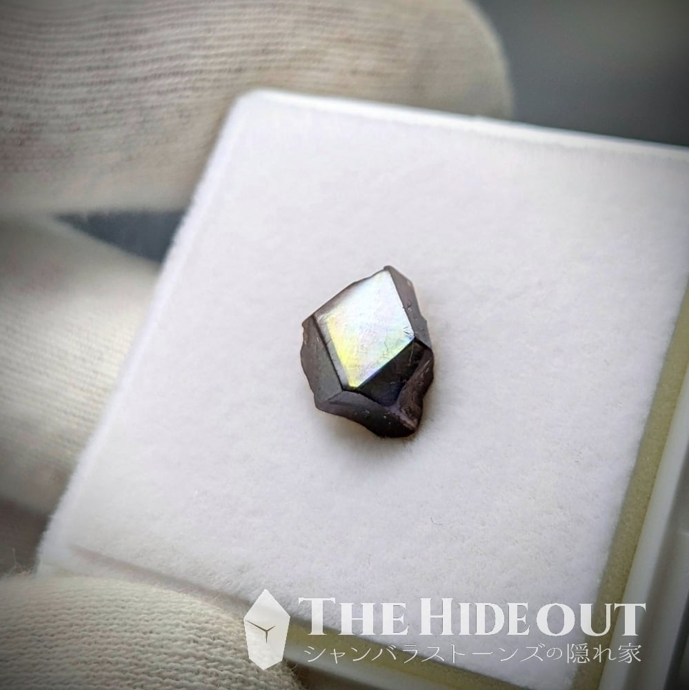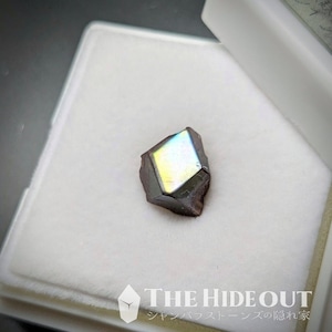 尚、この「レインボーガーネット」は鉱物種としては「アンドラダイト(灰鉄柘榴石)」になります。それ自体はオレンジを帯びた褐色ですが、表面を覆う金属皮膜が光の反射によって金属特有の極彩色を示すという特徴があります。