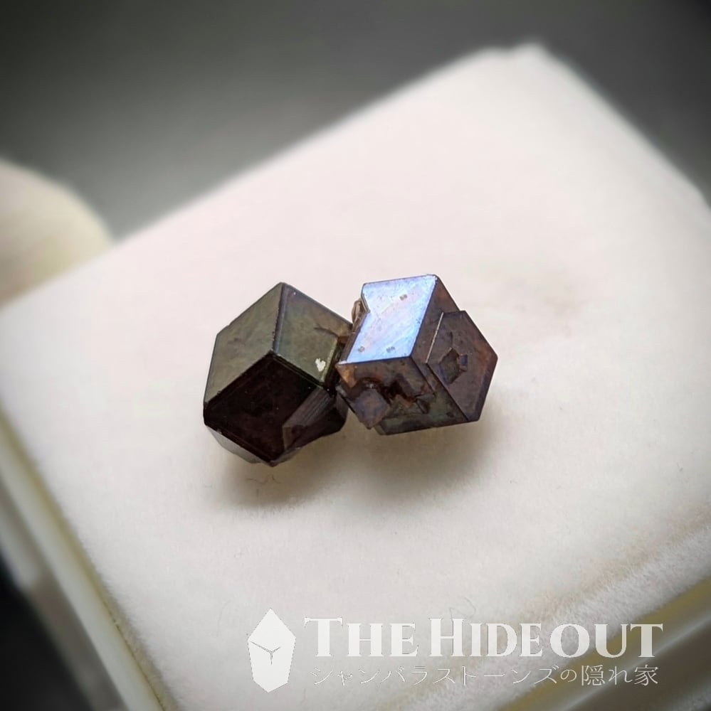 尚、この「レインボーガーネット」は鉱物種としては「アンドラダイト(灰鉄柘榴石)」になります。それ自体はオレンジを帯びた褐色ですが、表面を覆う金属皮膜が光の反射によって金属特有の極彩色を示すという特徴があります。