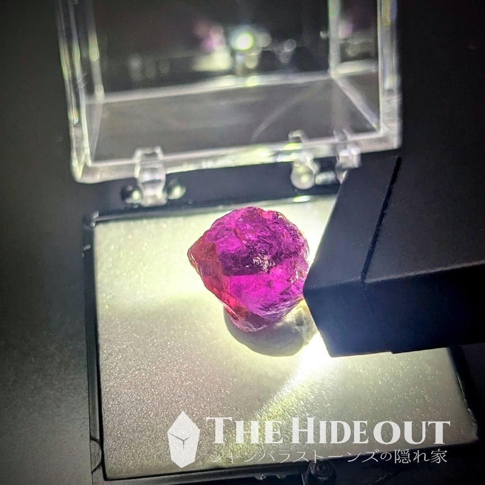 ああ、なんてことだ。強い光に当てずとも自然光で透けているではないか。こんなに綺麗なピンクパープルがあって良いのか。この産地で産出するロードライトの中でBestでなくとも最高クラスのクオリティと言って良いでしょう。珍しさも美しさも産地としての珍奇性も最高潮。蒐集すべきだと思います。繰り返しですが、自然光で透けるものは稀にしか無いですからね。