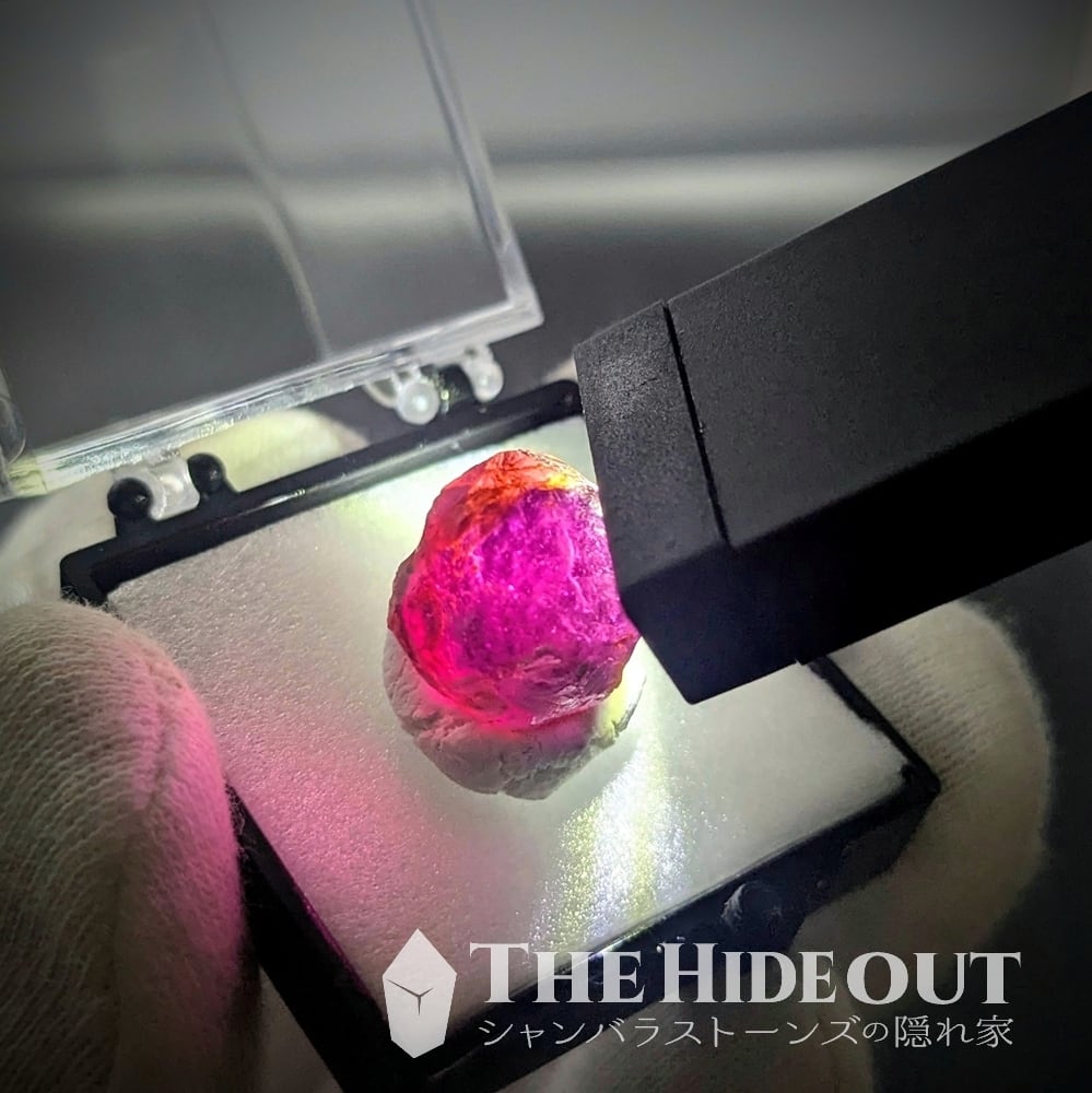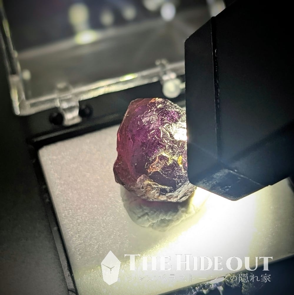 なのでこの大きさでも大きいほうです。しかしこの標本は自然光でもパープルピンクなのがわかりますし、強い光で透かしたならば驚愕世界が浮かび上がります。内部のクラックが少ないのでダイナミックな色が楽しめます。ややピンクが強い?かもしれません。