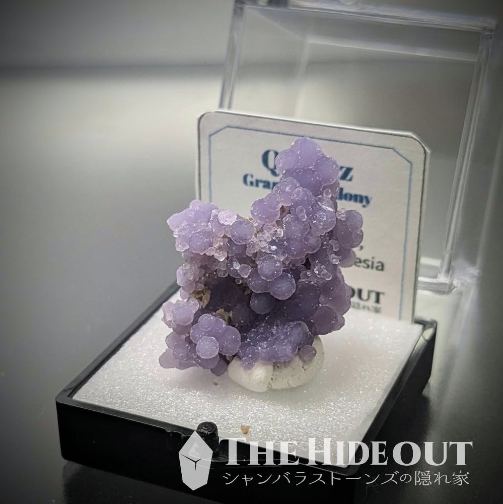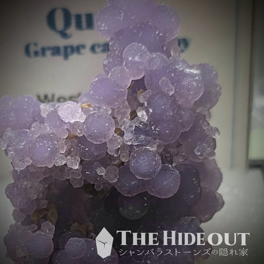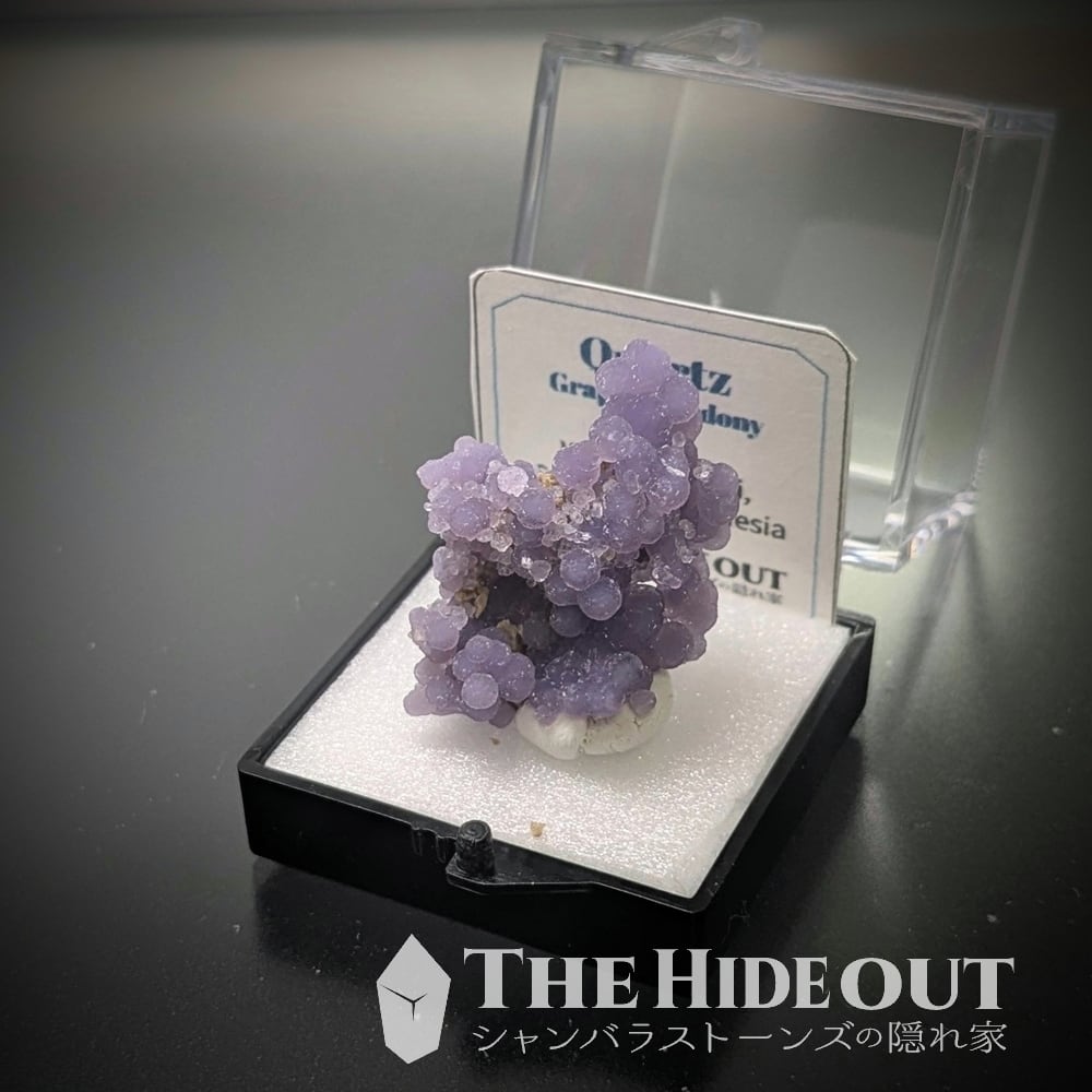 「グレープクォーツ」「グレープカルセドニー」「グレープアゲート」という通称がありますが、最も表現として相応しいのはカルセドニーですかね(結晶形が明瞭に見えるものがあるという事で「クォーツ」として分類するケースも多いようです)