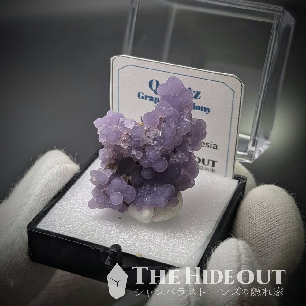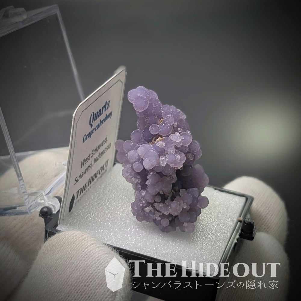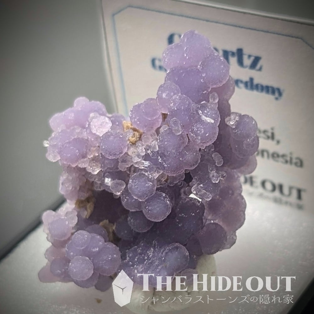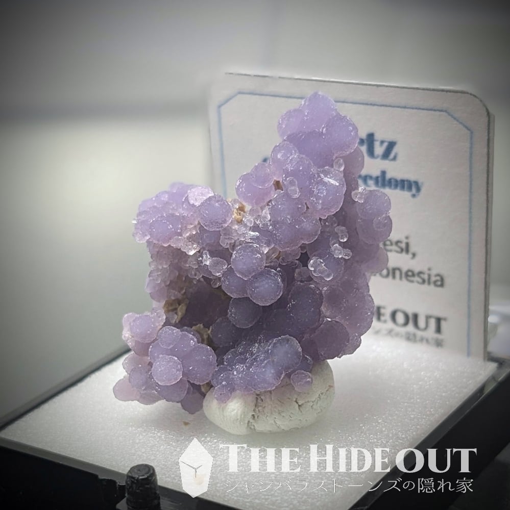 「グレープクォーツ」「グレープカルセドニー」「グレープアゲート」という通称がありますが、最も表現として相応しいのはカルセドニーですかね(結晶形が明瞭に見えるものがあるという事で「クォーツ」として分類するケースも多いようです)