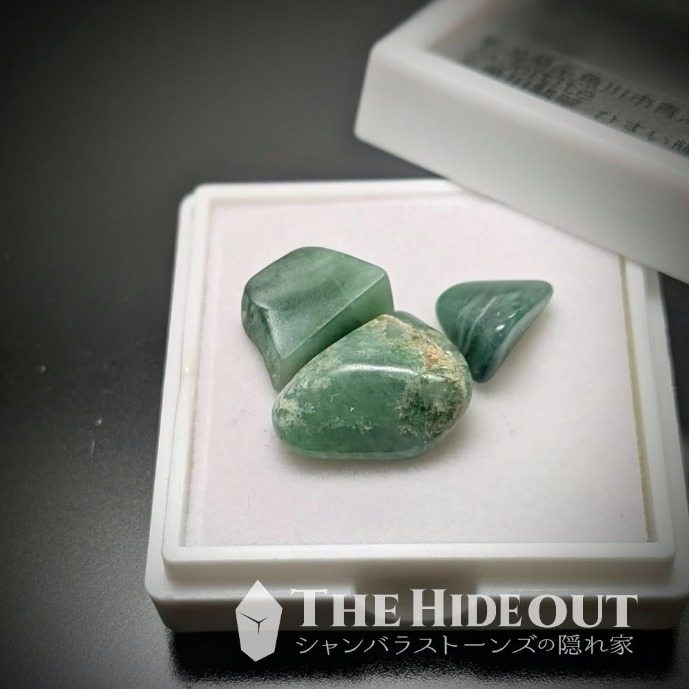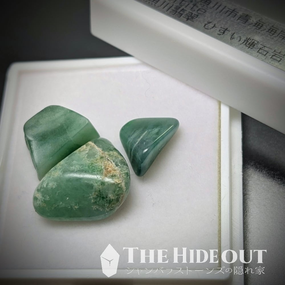 それにしてもご覧の通り鮮烈なグリーンです。こんな鮮やかな糸魚川翡翠をコレクションできるだけで心は満たされると思います。しかももってけ泥棒状態で3つも詰め込んじゃいました。ルースケースにぎゅうぎゅうなんて贅沢ですね。持ってって。