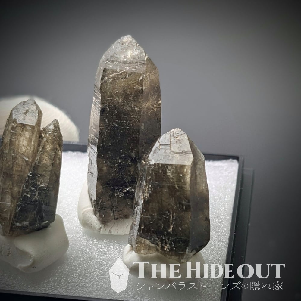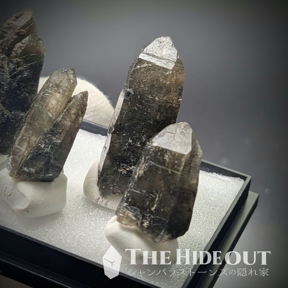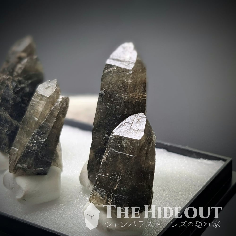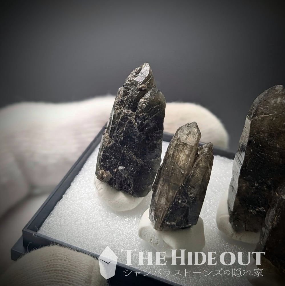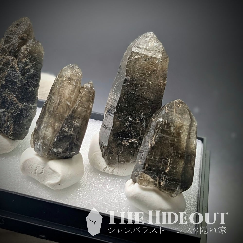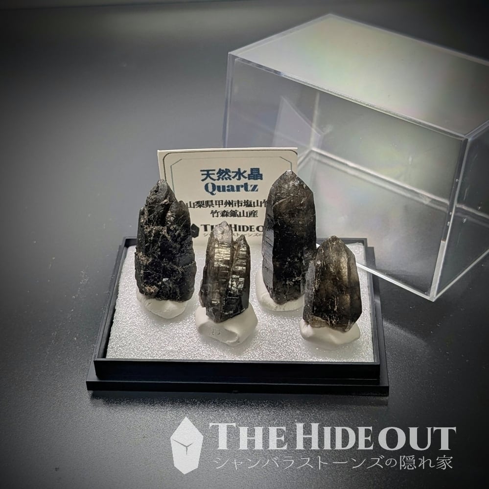他の竹森水晶のページにも書いたと思いますが、私の印象ではこのようにドラバイトびちびち、青龍の住処のように見えるものが最も竹森インクルージョンのレアパターンだと思います。ドラバイトが濃密すぎると表面の輝きを失って結晶形が明瞭でなくなる事が多いので「内包物がしっかりと入りつつ表面の艶やかさ・美しい結晶形を保っているもの」の評価を高くしております。見て下さい、この4つ。どれも結晶形が綺麗、表面も艶やかなのに内包物もビチビチ。特に右から2番目は最高の最高。これを手に入れるだけでも価値が大いにある、と言っても過言ではありません。