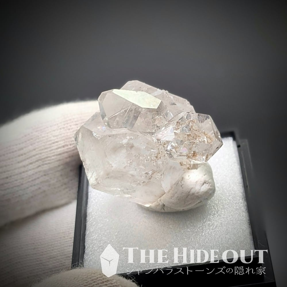 この産地では圧倒的多数がDT形状であり、稀に「ダイヤモンドクォーツ」と呼ばれるほどに照り・艶・反射が強いものが産出します。誰が呼んだか本場「ハーキマー」ダイヤモンドならぬ「パーキマー」 これらの水晶の中には黒いカーボンが内包されているものが多くありますが、同時に液体もインクルしているために、黒いカーボンがボコッと大きく動くことがあります。当然、液体バブルが動くものもあります。
