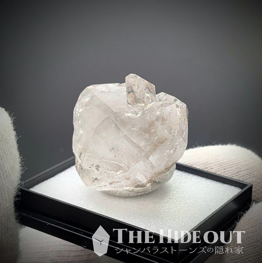見て下さい。複雑すぎて平面(写真)ではわかりません。動画で見てもらったほうが良いでしょう。小結晶が2つ親の結晶にめり込んでいます。このめり込みっぷりだけでも十分に面白いのですが、めり込まれている水晶もDTという。DTがDTにめり込まれてどうなってるの?状態です。しかもよく見るとうっすらスモーキーのゾーニングも見られます。オマケにこの産地の特徴である黒いカーボン内包物も。さらにさらに!ダイヤモンドの如く輝きと照りも強いですよね。評価ポイントがたくさんあって、、、こんな面白い水晶あります?
