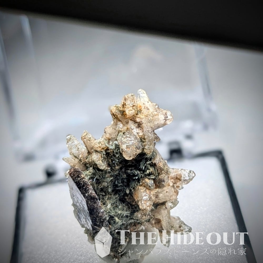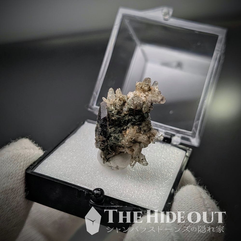 こちらは斧石に水晶が付着、しているのではなく群生水晶に斧石が付着しているタイプ。今までの逆ですね。水晶のミニクラスターなのですが、側面にピタッと斧石が付着しております。斧石らしいシャープな形はとても良いのですが残念ながら透過性はありません。