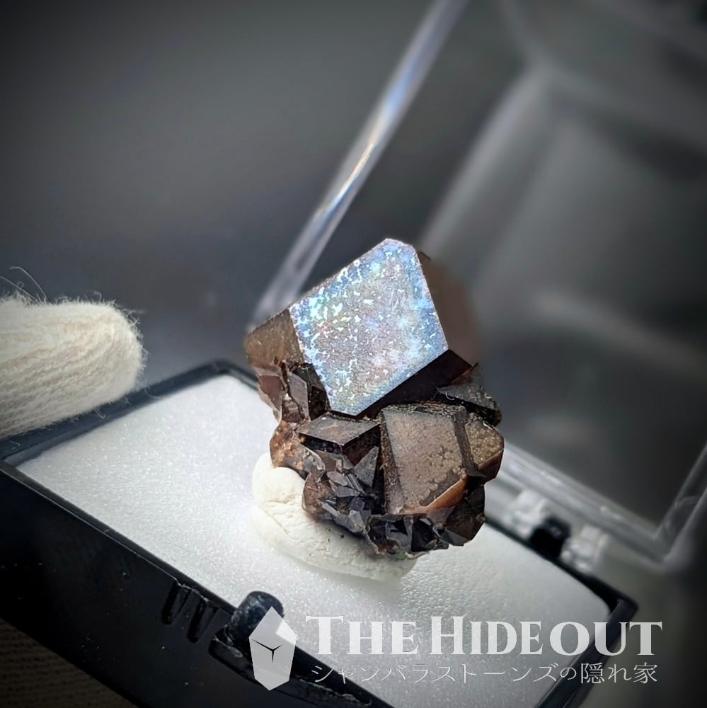 尚、この「レインボーガーネット」は鉱物種としては「アンドラダイト(灰鉄柘榴石)」になります。それ自体はオレンジを帯びた褐色ですが、表面を覆う金属皮膜が光の反射によって金属特有の極彩色を示すという特徴があります。