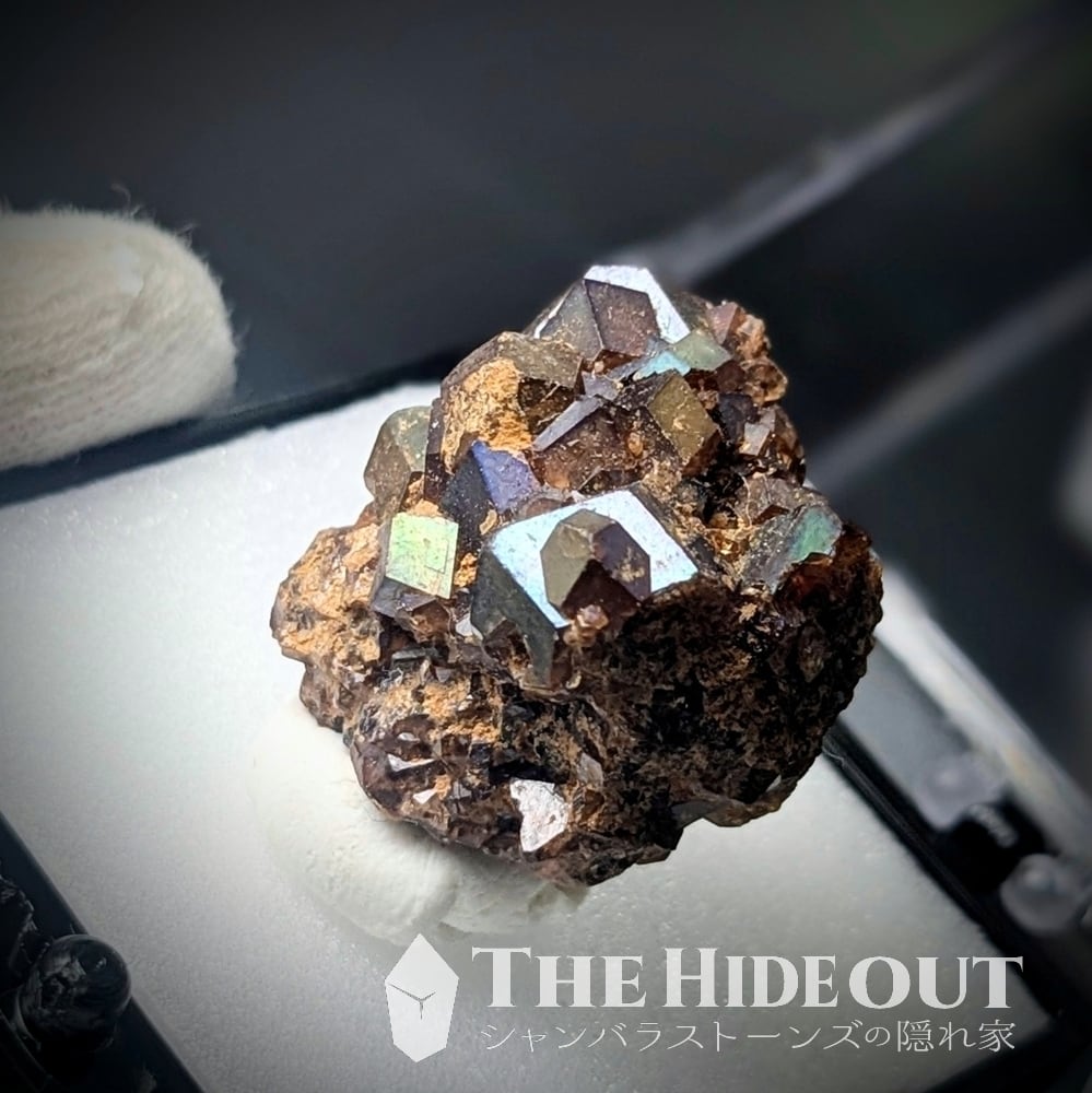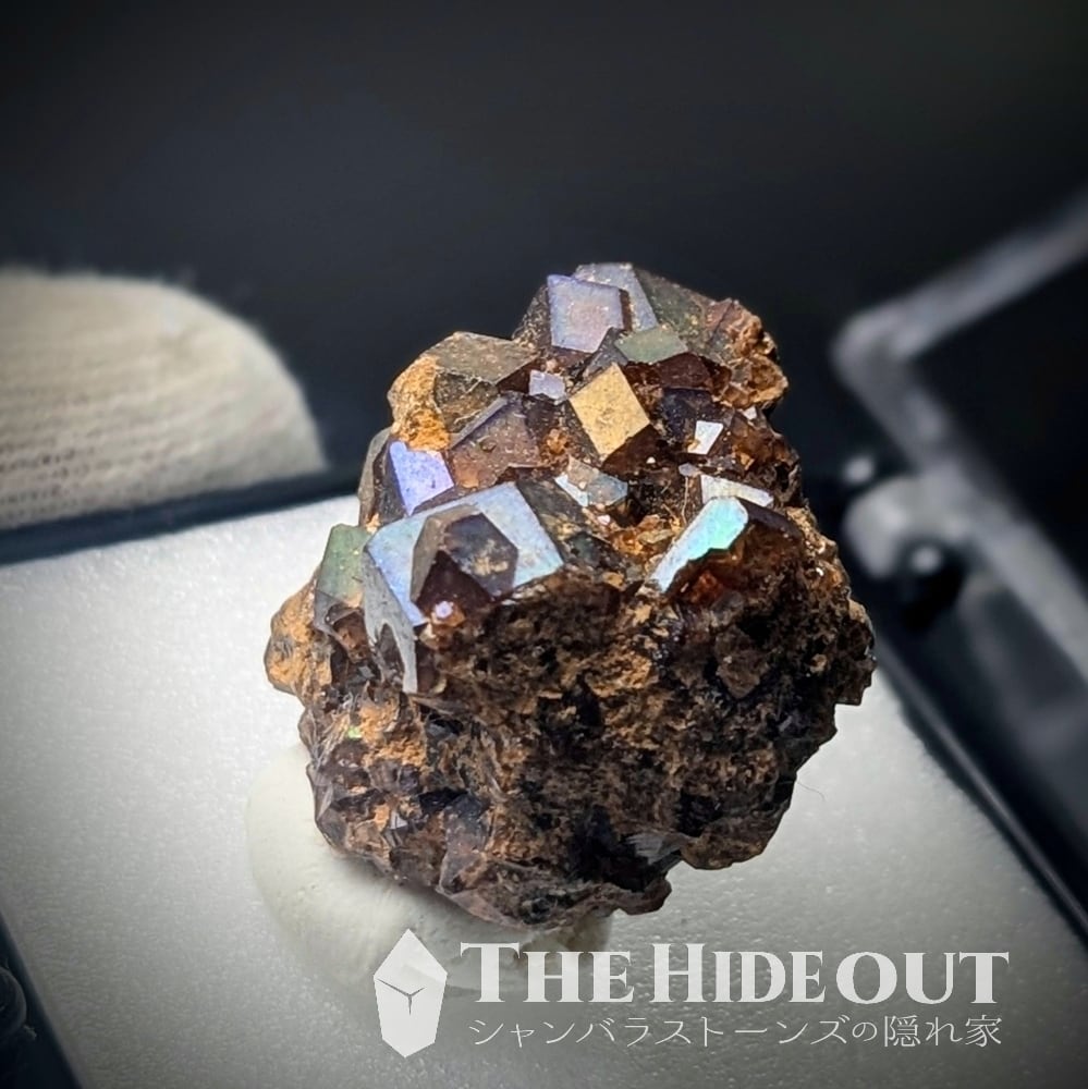尚、この「レインボーガーネット」は鉱物種としては「アンドラダイト(灰鉄柘榴石)」になります。それ自体はオレンジを帯びた褐色ですが、表面を覆う金属皮膜が光の反射によって金属特有の極彩色を示すという特徴があります。