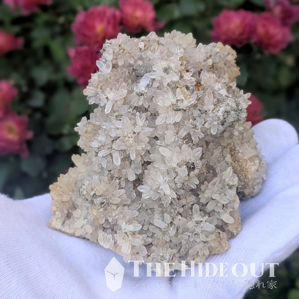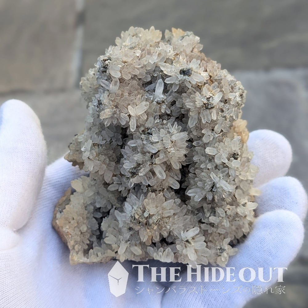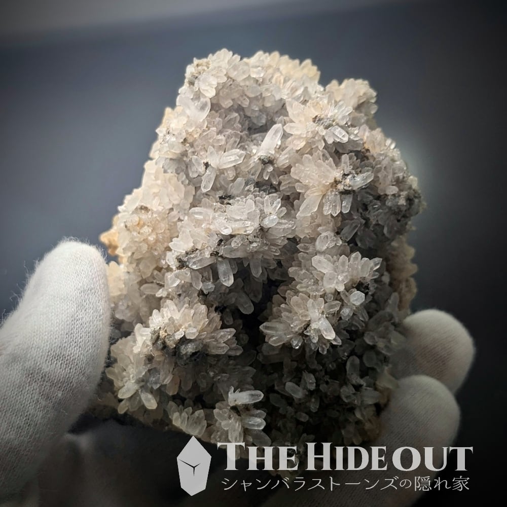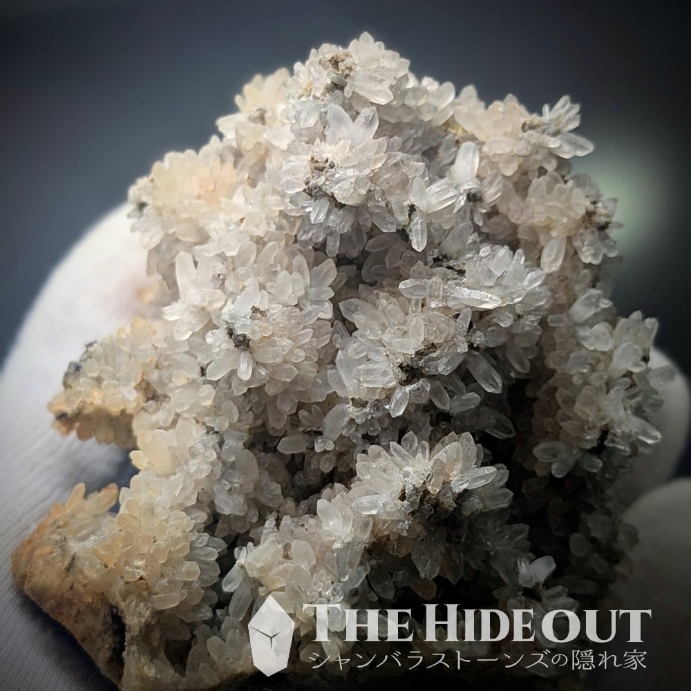 珍産地です!秩父鉱山橋掛沢産。そう、ここはグロッシュラーと同じ鉱山です。グロッシュラーの解説で記載していますが、この産地が活況を呈していたのは何十年も前の話。当時はグロッシュラーと共に水晶も採掘されており、橋掛沢の水晶は稀にパイライト入りやパイライト付着も確認されていたそう。※残念ながら今回のロットには見られませんでした。水晶の結晶が細く小さいのですが、結晶群が「菊の花」のように放射状に広がるのもこの産地の特徴です。「菊花水晶」などと呼ばれるようですが風情がありますね。
