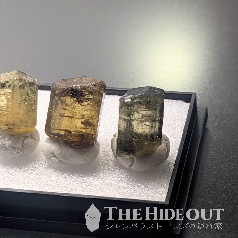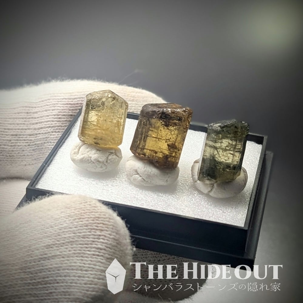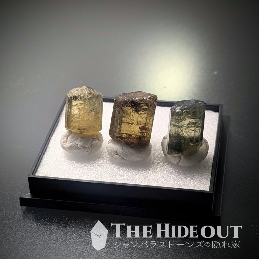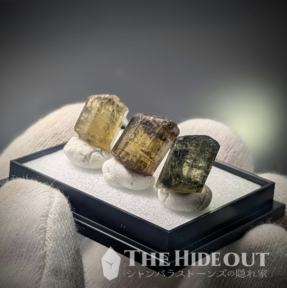 打って変わって写真が映え映えです。いえ、写真映えではなく現物が映えているのです。現物映えです。よくもまあ良い感じで良い感じのサイズで良い感じの質の3つを揃えることができたものだ、と思います。尚、最も希少な色はグリーンです。グリーンで色が沈むことなく結晶形が綺麗に保たれているものは本当に少ないです。今夜はこの3色で乾杯してください。